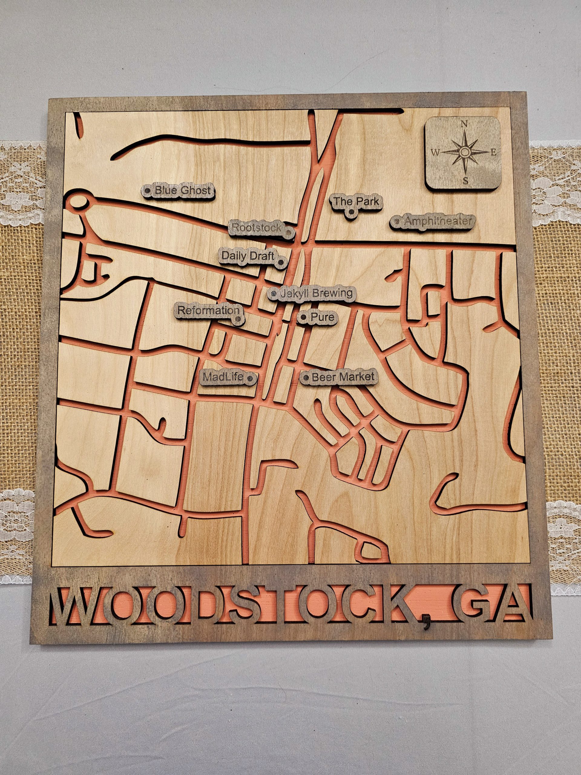 Handmade and laser cut three layer wood map. Beautifully laser cut maps of some of the best towns in America. These maps are custom made in your favorite colors and the landmarks can be personalized to your choice. They are a great way to remember your your current town, favorite vacation spot, or even the town where you made all your childhood memories. This is a definite show stopper and will not disappoint.